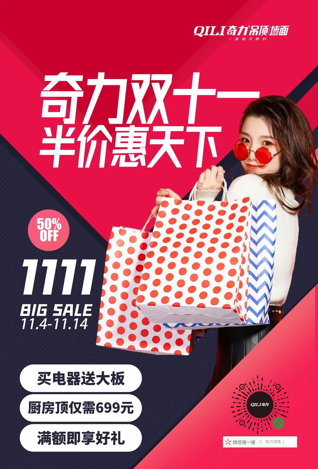奇力頂墻雙十一活動(dòng)開始啦! 全場(chǎng)50%的鉅惠力度 買電器送大板.....福利多多 活動(dòng)時(shí)間:2021年11月4日—11月14日