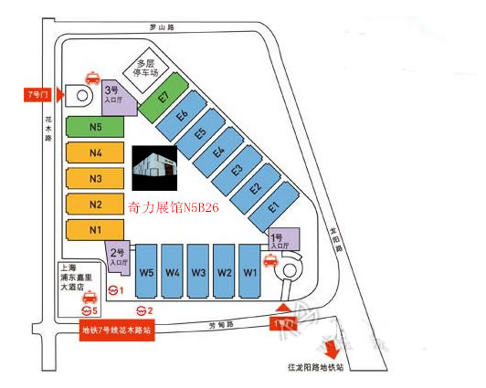 地鐵:可乘1號線到人民廣場站,換乘2號線至龍陽路站下,步行或換乘7號線至上海新國際博覽中心;約45分鐘;車費5元(價格以實際為準)。