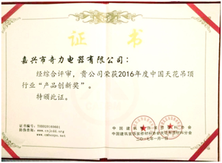 嘉興市奇力電器有限公司做為吊頂行業(yè)公認(rèn)的“十大品牌”和中國建筑裝飾裝修材料協(xié)會天花吊頂材料分會常務(wù)副會長單位,應(yīng)邀參加了這次盛會。公司憑借優(yōu)異的研發(fā)團(tuán)隊(duì)和在吊頂產(chǎn)品創(chuàng)新中取得的不俗成績,榮獲2016年度中國天花吊頂行業(yè)“產(chǎn)品創(chuàng)新獎”。