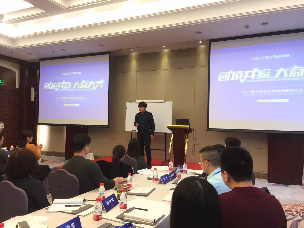 8日晚上,“創頂共贏,大商大勢”戰略研討會開始。由洪總開場,奇力家人分成7個小組,回顧分享2016年的營銷事件。各組上臺對2016年進行總結跟分享,提出疑惑,有黃老師、雷老師、洪總給予建議。黃老師從團隊配置、人員分工、薪資設置、提升單值,安裝售后等方面給予分享,最后由洪總總結我們2016年遇到的共性問題。